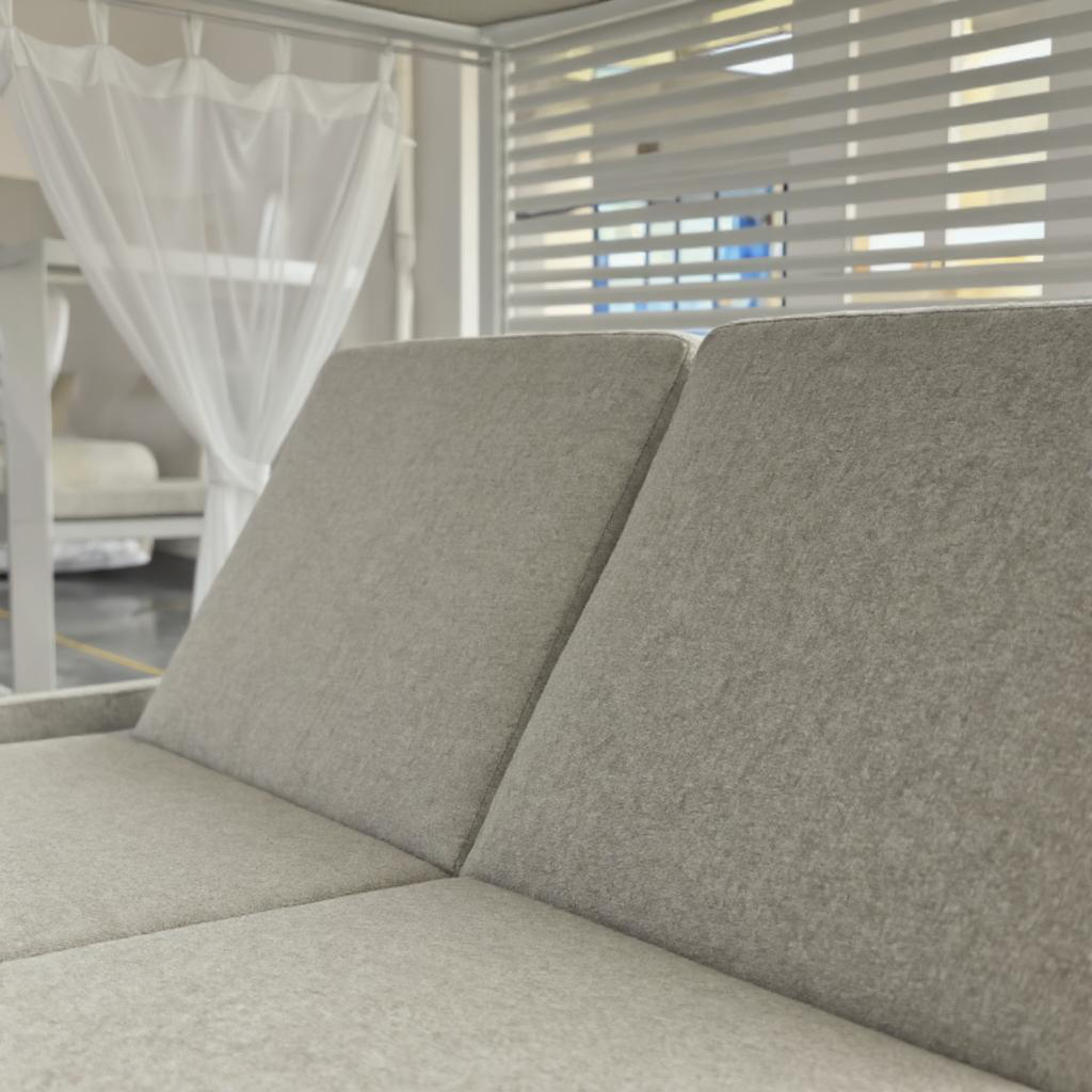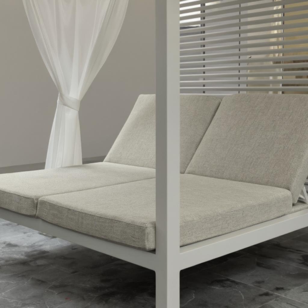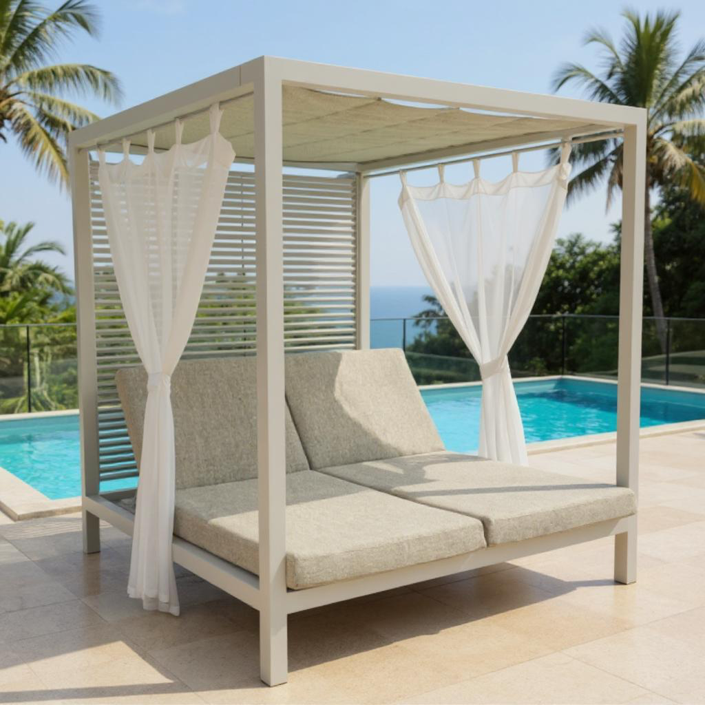 Esta cama balinesa de diseño contemporáneo está concebida para ofrecer lujo y confort en espacios exteriores. Su estructura cúbica de aluminio pintado en blanco mate es resistente a la exposición solar intensa, la humedad y los cambios climáticos, ideal para jardines, terrazas o zonas de piscina. Los colchones gruesos en tejido beige claro están fabricados con materiales técnicos que no se decoloran y son altamente resistentes al moho. Las cortinas blancas translúcidas aportan un toque elegante sin perder funcionalidad. Todo el conjunto se puede limpiar fácilmente con agua a presión, lo que lo hace perfecto para entornos de hotel, beach club o residencias privadas que buscan estilo, durabilidad y bajo mantenimiento.
