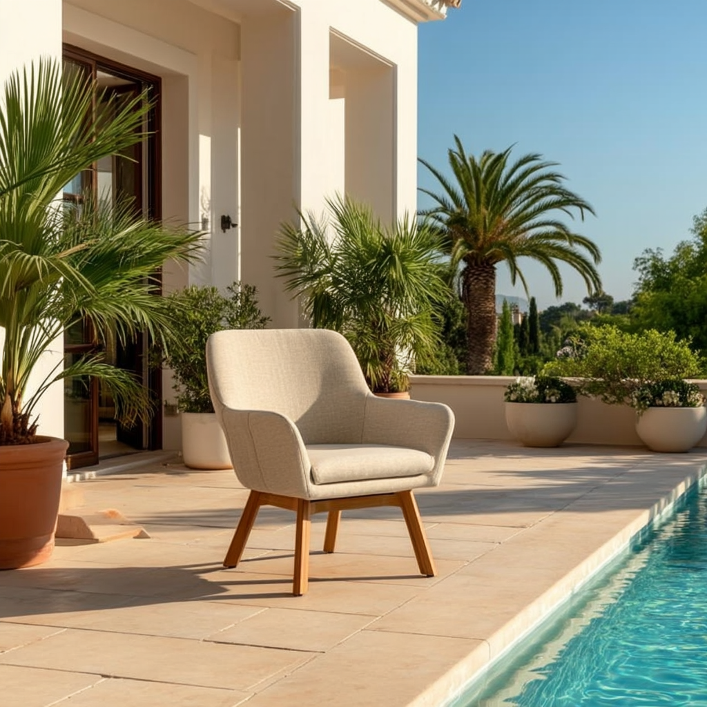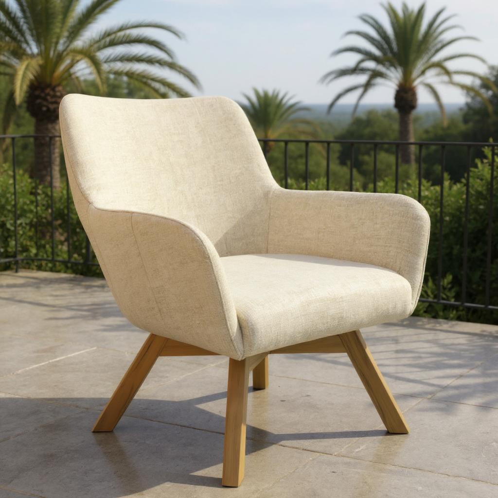El sillón de exterior Duna destaca por su silueta envolvente, con un respaldo alto y líneas suaves que aportan elegancia y confort. Tapizado en tejido técnico beige claro, es resistente a la radiación solar, la humedad y el uso intensivo en exteriores. Su base cruzada en madera tratada garantiza estabilidad y aporta un contraste cálido y natural. Perfecto para crear rincones lounge o comedores exteriores con un toque sofisticado. Además, Duna es lavable con agua a presión, lo que lo convierte en una pieza funcional, duradera y estéticamente refinada.