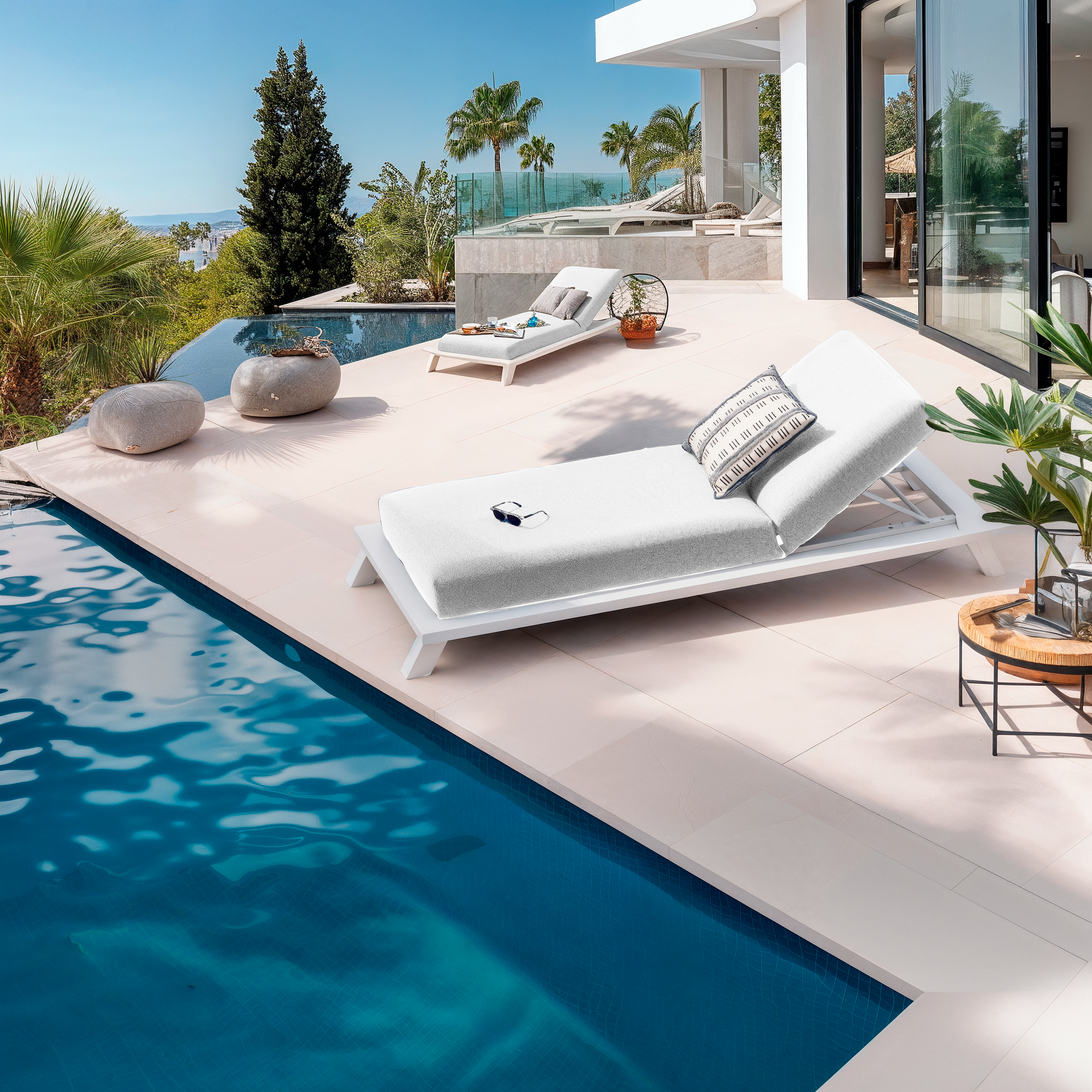Tumbona blanco confortable, elegante y moderna. Resistente al Sol, la Lluvia, Lavable a Alta Presión