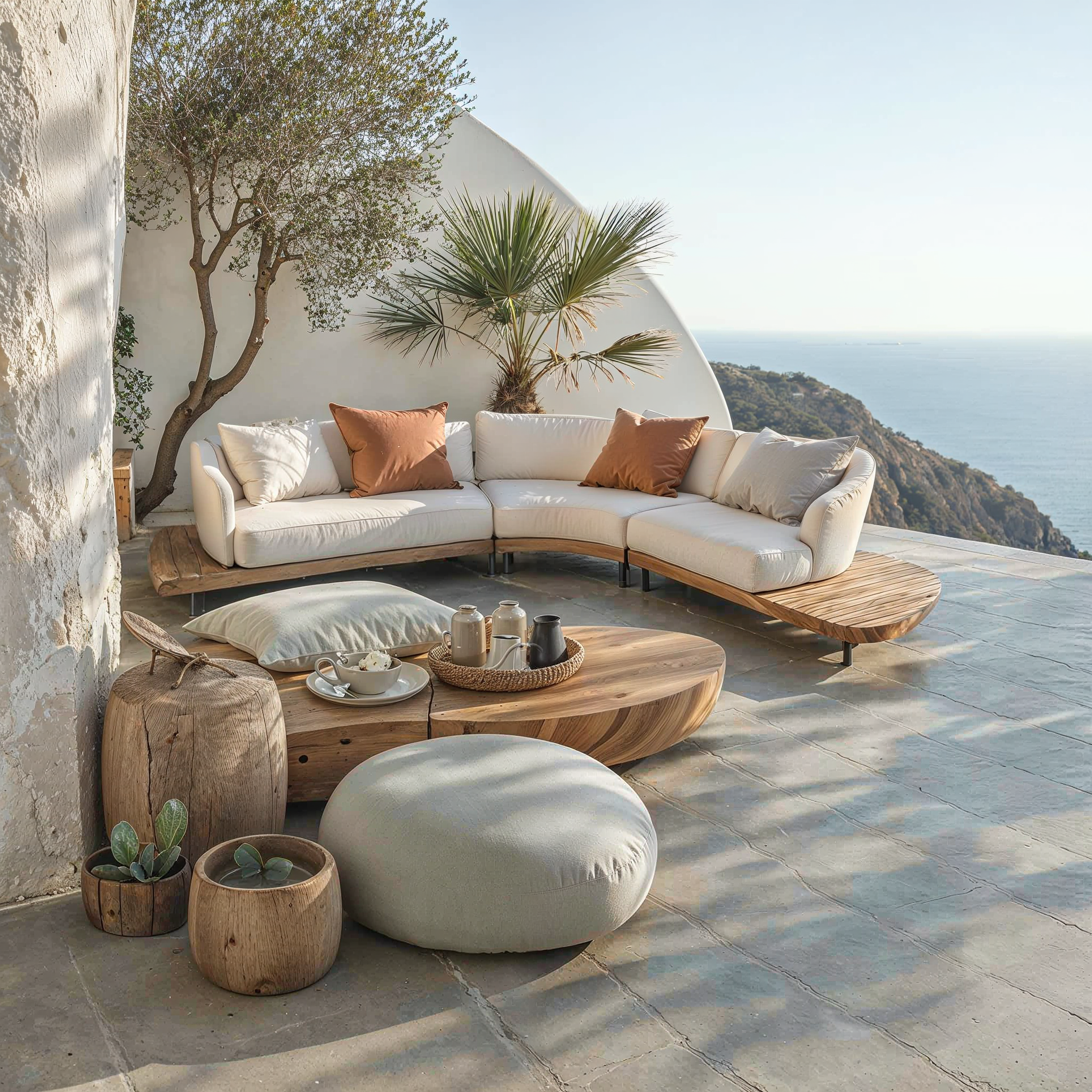 Orizon es un sofá modular curvo de exterior diseñado para impresionar. Su estructura fluida se asienta sobre una base de madera tratada con lamas horizontales que aportan un toque cálido y arquitectónico. Los módulos tapizados en tejido técnico beige claro ofrecen gran confort y elegancia visual. Cada elemento está fabricado para resistir el sol, la humedad y el uso intensivo en exteriores. Con sus formas suaves y diseño envolvente, Orizon es perfecto para crear zonas lounge exclusivas en villas blancas, hoteles boutique o terrazas de lujo frente al mar. Fácil de limpiar con agua a presión.